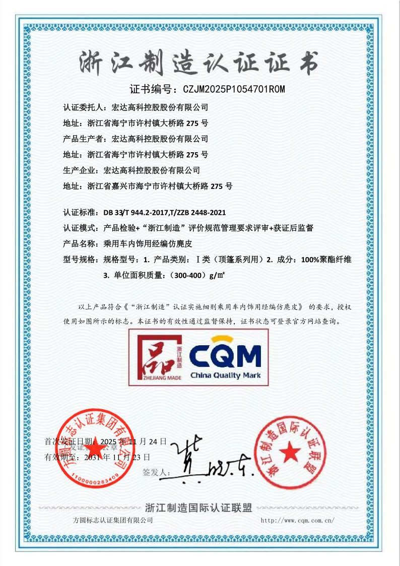 近日,宏達(dá)高科自主研發(fā)的“乘用車內(nèi)飾用經(jīng)編仿麂皮”產(chǎn)品順利通過“浙江制造”認(rèn)證,榮獲《浙江制造認(rèn)證證書》(證書編號(hào):CZJM2025P1054701ROM)。該認(rèn)證依據(jù)DB 33/T 944.2-2017、T/ZZB 2448-2021標(biāo)準(zhǔn)嚴(yán)格審核,標(biāo)志著我司產(chǎn)品在品質(zhì)穩(wěn)定性、技術(shù)創(chuàng)新性及環(huán)保安全性等方面均達(dá)到“浙江制造”高標(biāo)準(zhǔn)要求。